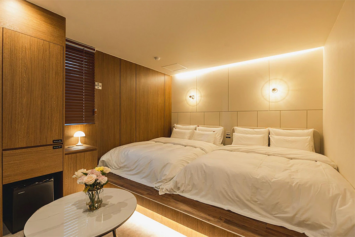 객실은 단정하면서도 감각적인 무드로 꾸며져 짧은 숙박은 물론 반복 숙박에도 잘 어우러집니다.