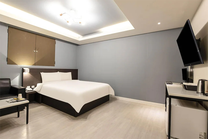 객실은 단정하면서도 부드러운 감성으로 꾸며져 짧은 숙박은 물론 반복 숙박에도 잘 어우러집니다.