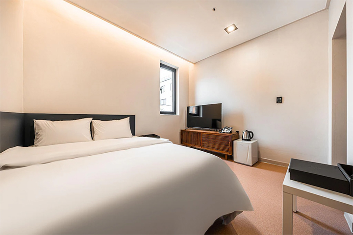 객실은 단정하면서도 개성이 느껴지는 구성으로 짧은 숙박은 물론 반복 체류에도 잘 어우러집니다.
