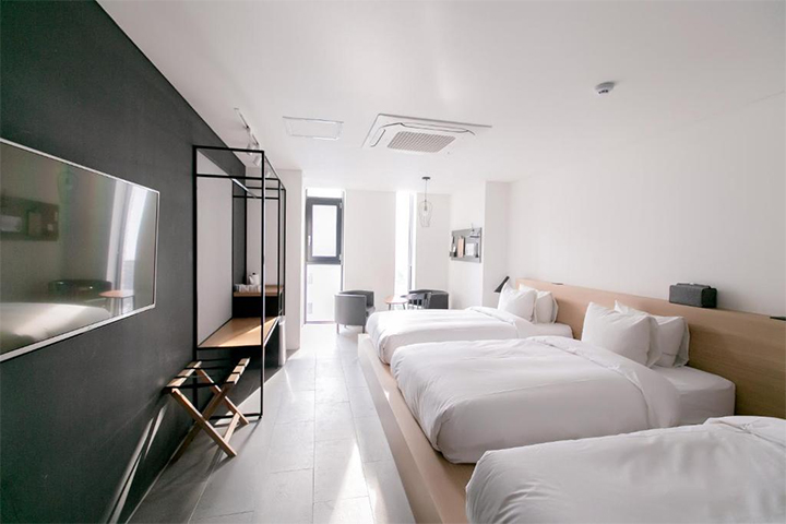 객실은 단정하면서도 개성이 느껴지는 구성으로 짧은 숙박은 물론 반복 체류에도 잘 어우러집니다.